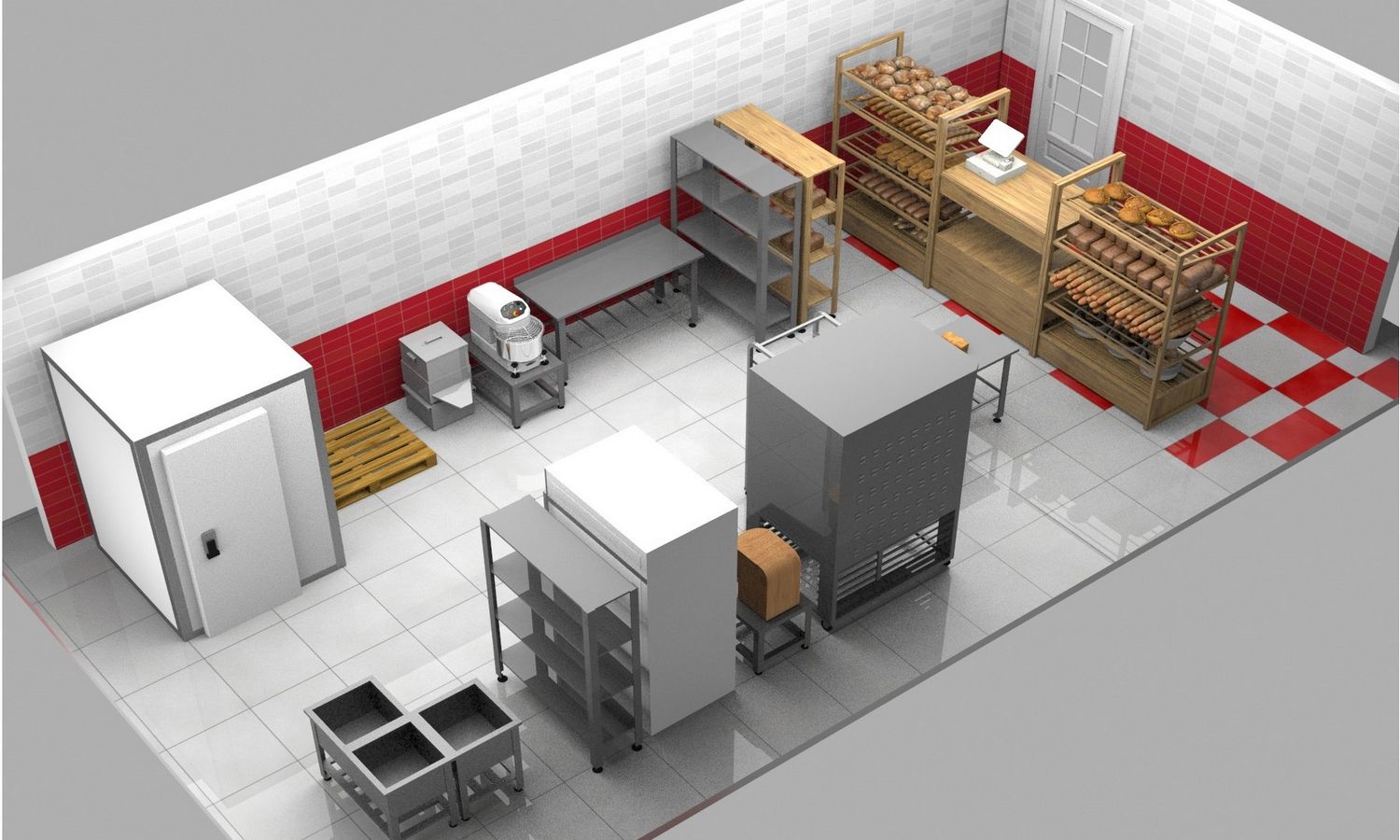 - Пекарня/кондитерская. Кухня пекарни отличается от кухни ресторана, так как технологический процесс иной (замес → расстойка → выпечка). Основные зоны здесь: склад муки и ингредиентов, замесочное отделение, пекарский цех и упаковка/торговля (если это пекарня-магазин). В пекарне очень важно выдерживать санитарные требования к чистоте, потому что мука создает много пыли. Помещение для замеса теста оснащается мукопросеивателем (его лучше изолировать крышкой), мощным тестомесом – это оборудование ставят вблизи от места хранения мешков с мукой для удобства загрузки. Полы и столы должны легко отмываться от муки; часто в пекарнях ставят специальные вытяжные зонты над тестомесильными машинами и печами для отведения теплого влажного воздуха. Расстойный шкаф (шкаф для подъема теста) обычно размещают рядом с печами. Сами печи (хлебопекарские шкафы) – центральный элемент: их ставят у стены, подсоединяют к вытяжке высокого температурного исполнения. Вокруг печей нужно оставить пространство для тележек, противней – учесть это при расстановке. Кондитерское производство добавляет секцию охлаждения и декорирования: после выпечки изделия остывают на стеллажах, затем кондитер украшает их на отдельном столе. Эта зона отделена от "грязных" процессов типа замеса, чтобы в крем не попала мука. Практический совет для пекарни: естественное освещение и хорошая вентиляция – ваши союзники. Желательно наличие окон, так как пекари работают часто ночью/рано утром, и микроклимат (тепло от печей) должен компенсироваться притоком свежего воздуха. Пекарня относится к взрыво- и пожароопасным объектам (мучная пыль может вспыхнуть), поэтому все электромоторы (мешалки, вентиляторы) должны быть искробезопасными, а розетки – герметичными. Оборудование расставляют с учетом уборки: например, большие печи ставят на ножках или подиуме так, чтобы под ними можно было вымести муку. Также необходимы емкости для отходов теста и мусора с крышками, расположенные по разным углам, – например, один бак около замеса (для обрезков теста), другой – у упаковки (для коробок, оберток).
