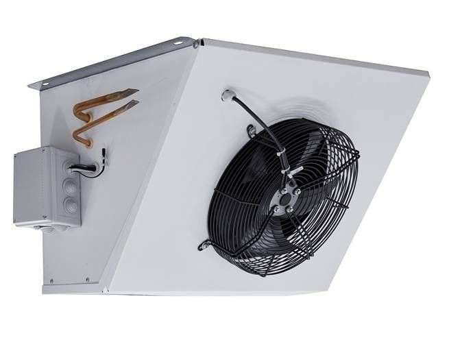 Вентиляторы осевые, мощные. Каждый двигатель оснащён встроенным термореле, которое защищает обмотку от перегрева при нарушениях вентиляции или длительной работе в предельных режимах. Оттайка — электрическая, ТЭНом. Это надёжный и распространённый способ для низкотемпературных и среднетемпературных камер: нагревательные элементы встроены в теплообменник и запускаются по таймеру или команде контроллера.