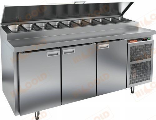 Основной сценарий — пиццерия с постоянным потоком заказов, где повар работает непосредственно у стола: берёт начинки из витрины GN, не отходя от рабочего места. Подходит также для линий итальянской кухни в ресторанах и кафе, где требуется держать охлаждённые ингредиенты на расстоянии вытянутой руки. Динамическое охлаждение быстро восстанавливает температуру после открытия дверей — важный плюс при высоком темпе работы. Ширина 1835 мм достаточна для одновременного размещения двух операторов.