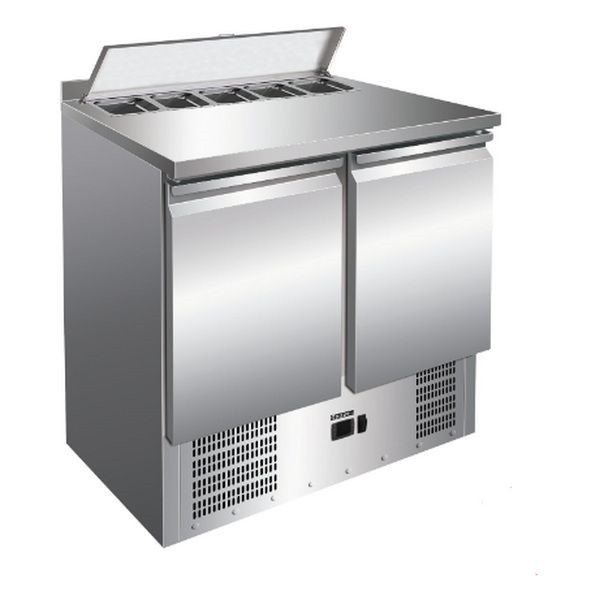 Корпус и столешница выполнены из нержавеющей стали. Столешница оснащена бортиком высотой 40 мм — жидкость не стекает на пол при работе с влажными продуктами. Нижний холодильный объём разделён на две секции с глухими дверями; каждая укомплектована одной полкой и парой направляющих под гастроёмкости GN 1/1. Охлаждение статическое с принудительной циркуляцией воздуха через вентилятор. Управление — электронный блок. Встроенный агрегат не требует выносного холодильного оборудования. Страна производства — Китай.