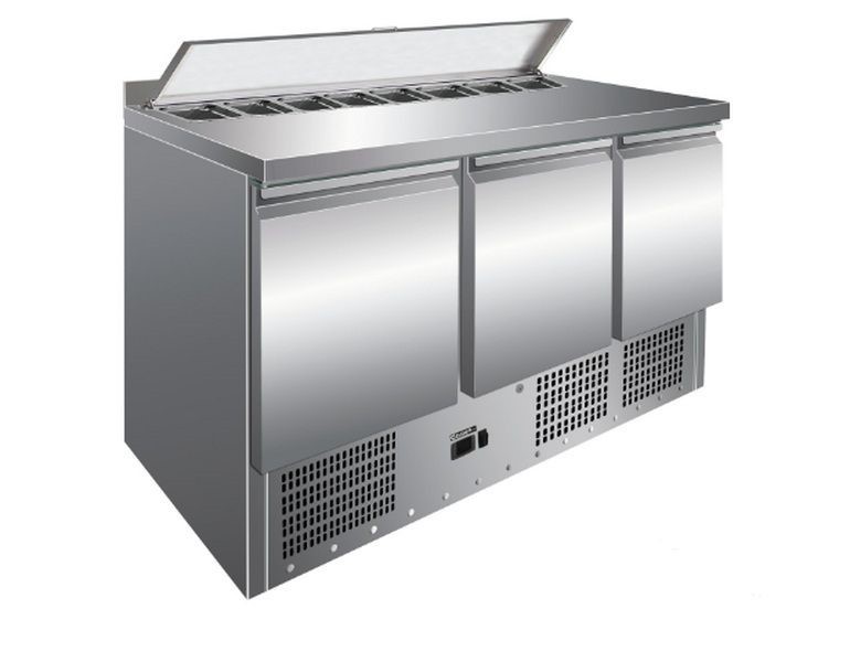 Корпус и рабочая столешница выполнены из нержавеющей стали. Столешница оснащена бортиком высотой 40 мм — он предотвращает случайное падение инвентаря и продуктов с поверхности. Нижний шкаф разделён на три секции с тремя глухими дверями; каждая секция укомплектована одной полкой и парой направляющих под гастроёмкости GN 1/1. Охлаждение статическое с принудительной циркуляцией воздуха через вентилятор, управление электронное. Агрегат встроенный. Климатический класс 4.