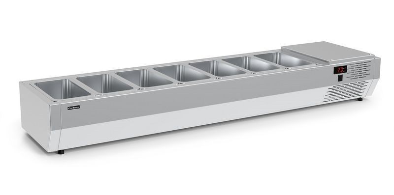 Витрина устанавливается на холодильные столы, столы для пиццы, барные стойки и прилавки как надставной элемент. На линии раздачи в ресторане или столовой она держит ингредиенты для салатов и пиццы в доступной зоне и в температуре. В магазинах и супермаркетах подходит для охлаждаемой выкладки деликатесов или готовых закусок. Формат GN 1/3 позволяет использовать стандартные гастроёмкости, совместимые с большинством кухонного инвентаря.