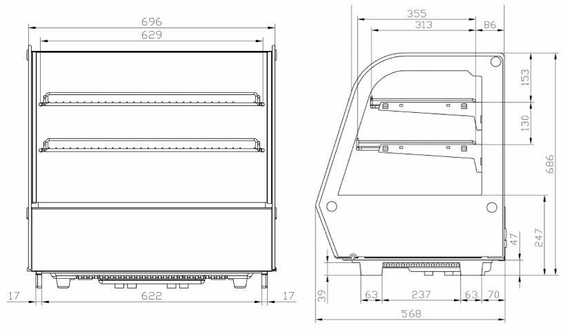 Ручное размораживание требует периодического участия персонала — необходимо заложить это в регламент обслуживания. Мощность по характеристикам составляет 0,23 кВт, тогда как в анонсе указано 0,16 кВт; перед заказом рекомендуется уточнить актуальное значение у поставщика. Габариты витрины — 700×570×690 мм, вес брутто 60 кг: при размещении на стойке убедитесь в достаточной несущей способности мебели.