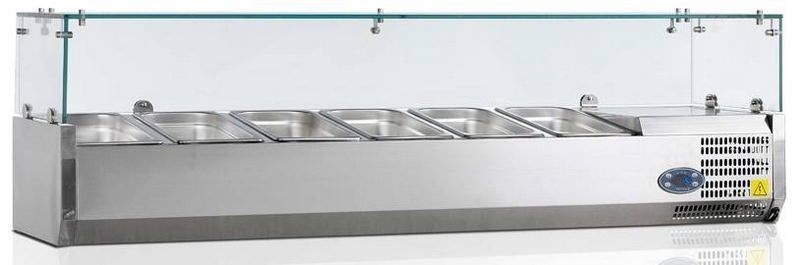 Витрина рассчитана на установку на барные стойки, раздачи и буфетные линии в кафе, ресторанах, столовых и магазинах готовой еды. Семь позиций GN1/4 с разделителями позволяют структурированно представить ассортимент — например, несколько видов нарезки, салатов или десертов одновременно. Формат настольной витрины удобен там, где нет места для напольного оборудования, но необходима открытая холодная зона вблизи кассы или точки выдачи.