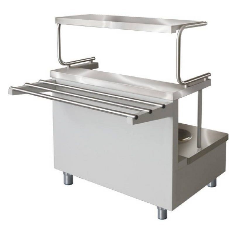 В задней части расположена широкая низкая полка с тремя встроенными электрическими конфорками. Термостаты для каждой конфорки вынесены на заднюю панель и управляются раздельно — можно поддерживать разную температуру под разные блюда. Сверху корпуса закреплена узкая столешница для выкладки тарелок с порционными блюдами.