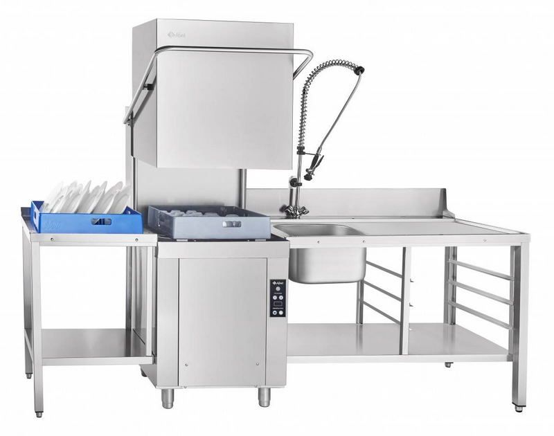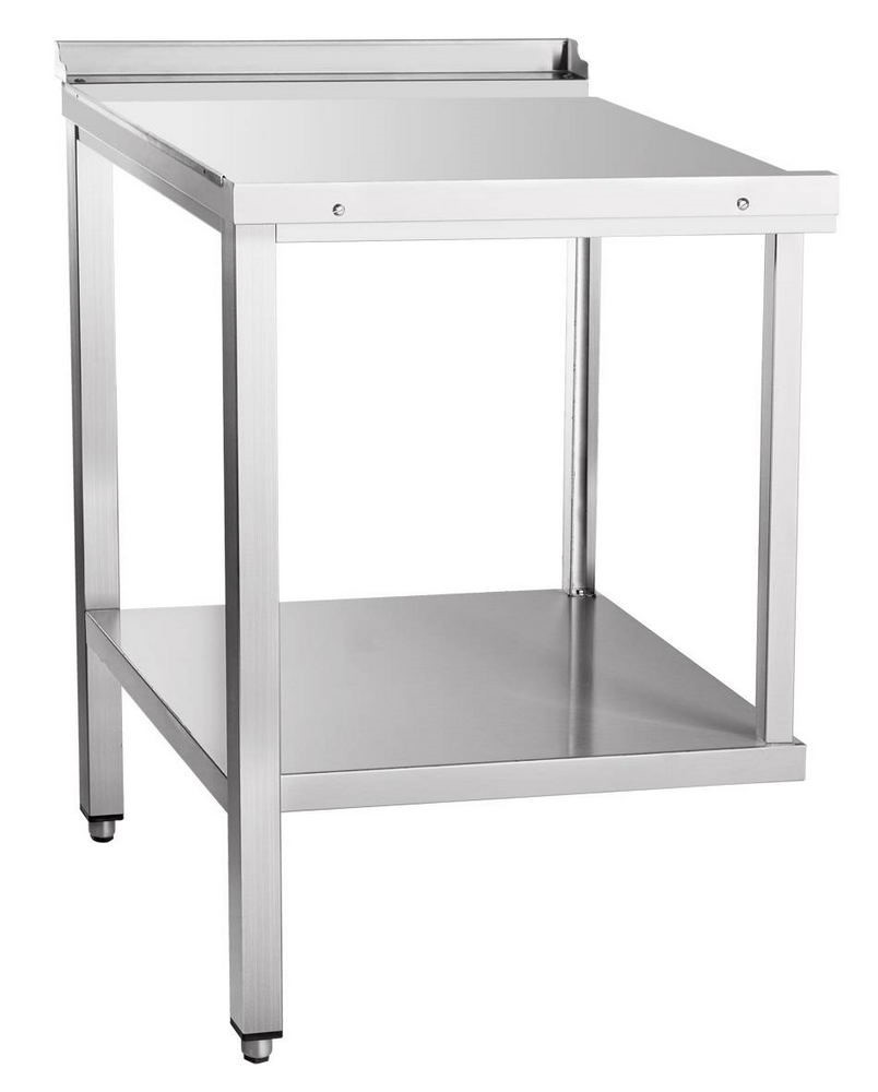 Весь корпус выполнен из нержавеющей стали AISI 304 — марки, стандартной для профессиональных кухонь с агрессивной влажной средой. Сталь не ржавеет при постоянном контакте с водой и моющими средствами, не деформируется под нагрузкой. Стол разборный: верхняя часть фиксируется к машине зацепным механизмом, нижняя — болтовым соединением, что обеспечивает жёсткую стыковку без люфта. Опорные ножки регулируются по высоте — можно выровнять стол относительно посудомойки даже на неровном полу. В комплекте одна полка для хранения инвентаря или посуды под столешницей. Вес изделия 17 кг.