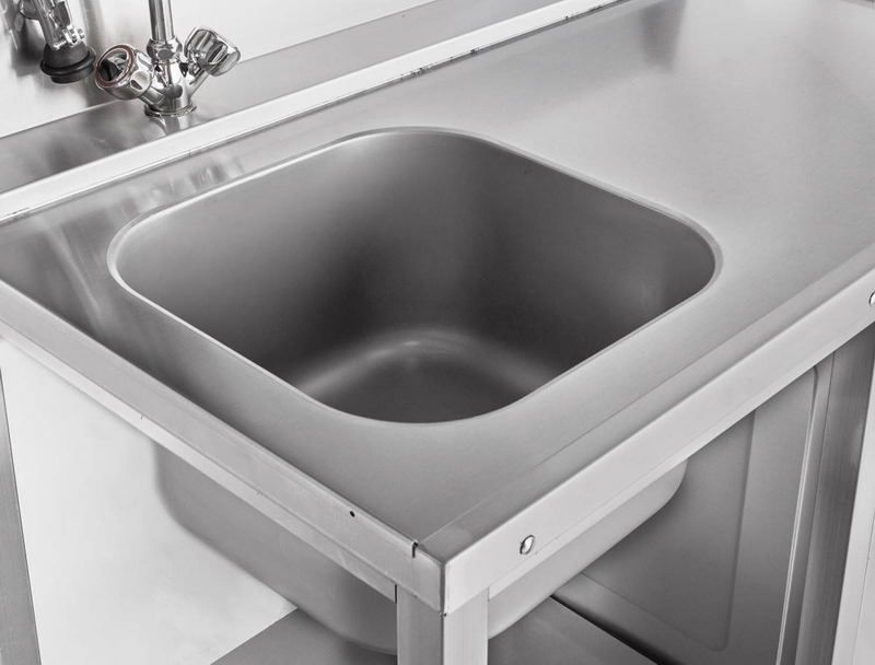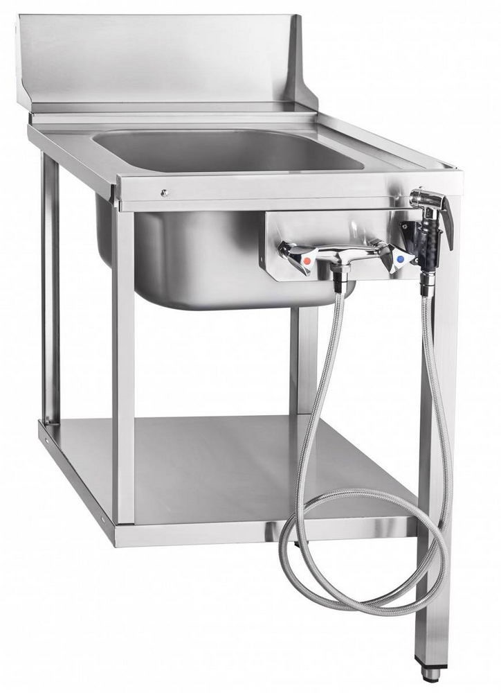 Корпус полностью выполнен из нержавеющей стали — материал не боится моющих средств, влаги и механических нагрузок в режиме постоянной эксплуатации. В столешницу вмонтирована раковина 400 × 400 мм глубиной 250 мм с цельнотянутой конструкцией: без сварных швов по периметру, что исключает скопление грязи и упрощает санитарную обработку. В нижней части — открытая полка для посудных корзин или другого инвентаря. Ножки регулируются по высоте — стол можно подогнать под конкретную линию мытья или неровный пол. В комплект поставки входит душирующее устройство для предварительного ополаскивания.