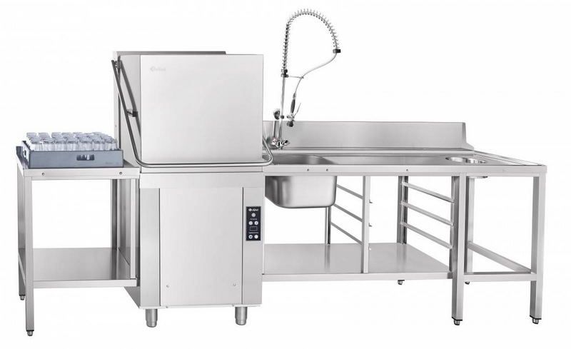 Корпус целиком выполнен из нержавеющей стали — материал выдерживает постоянный контакт с водой, моющими средствами и механические нагрузки в режиме непрерывной работы. Встроенная цельнотянутая моечная ванна размером 400 × 400 мм и глубиной 250 мм используется для первичного ополаскивания посуды и кухонного инвентаря перед загрузкой в машину. В комплект входит душирующее устройство. В рабочей зоне предусмотрено отверстие для сбора пищевых отходов. По бокам стола смонтированы направляющие под четыре кассеты стандартного формата 500 × 500 мм. Ножки регулируются по высоте — стол можно выровнять на неровном полу без прокладок.