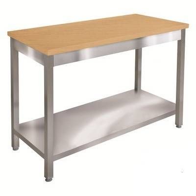 Деревянная столешница требует регулярного ухода: её нельзя надолго оставлять влажной и нежелательно мыть агрессивными моющими средствами — древесина потемнеет и начнёт трескаться. В заведениях с жёсткими требованиями санитарных служб к деревянным поверхностям уточните допустимость использования заранее. Если нужна поверхность, которую можно мыть под давлением, — рассмотрите аналоги с нержавеющей столешницей. Глубина стола 800 мм — стандарт для профессиональных кухонь, но при расстановке оборудования учитывайте необходимость свободного доступа спереди.