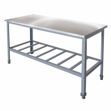 Стол ориентирован на заготовочные цеха, мясные и рыбные участки производственных кухонь ресторанов, столовых, комбинатов питания. Центральное расположение позволяет работать одновременно с двух и более сторон — удобно при бригадной разделке или на крупных заготовительных производствах. Решётчатая полка снизу закрывает потребность в хранении часто используемой посуды прямо у рабочего места.