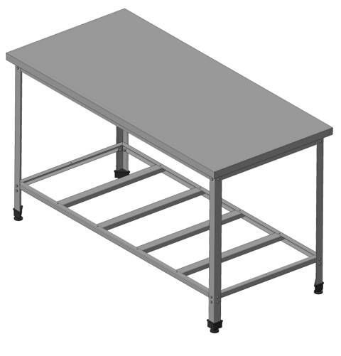 Столешница выполнена из нержавеющей стали толщиной 0,5 мм. Конструкция открытая: нижняя полка выполнена в виде решётки, что обеспечивает циркуляцию воздуха вокруг хранящегося инвентаря и упрощает уборку под столом. Ножки регулируются по высоте — стол можно выровнять на полу с небольшими перепадами и точно состыковать с соседним оборудованием по рабочей плоскости. Вес брутто 36 кг указывает на достаточно лёгкую конструкцию, что удобно при первоначальной расстановке оборудования.