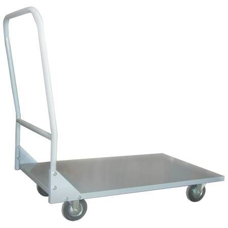 Тележка рассчитана на работу по ровным твёрдым поверхностям — плитке, бетону, линолеуму. Колёса 125 мм не предназначены для неровных или уличных покрытий. Грузоподъёмность в технических данных производителем не указана — уточняйте у поставщика перед применением с тяжёлыми металлическими грузами или крупными партиями продуктов. Тележка поставляется без дополнительных полок или бортов: платформа одноуровневая.