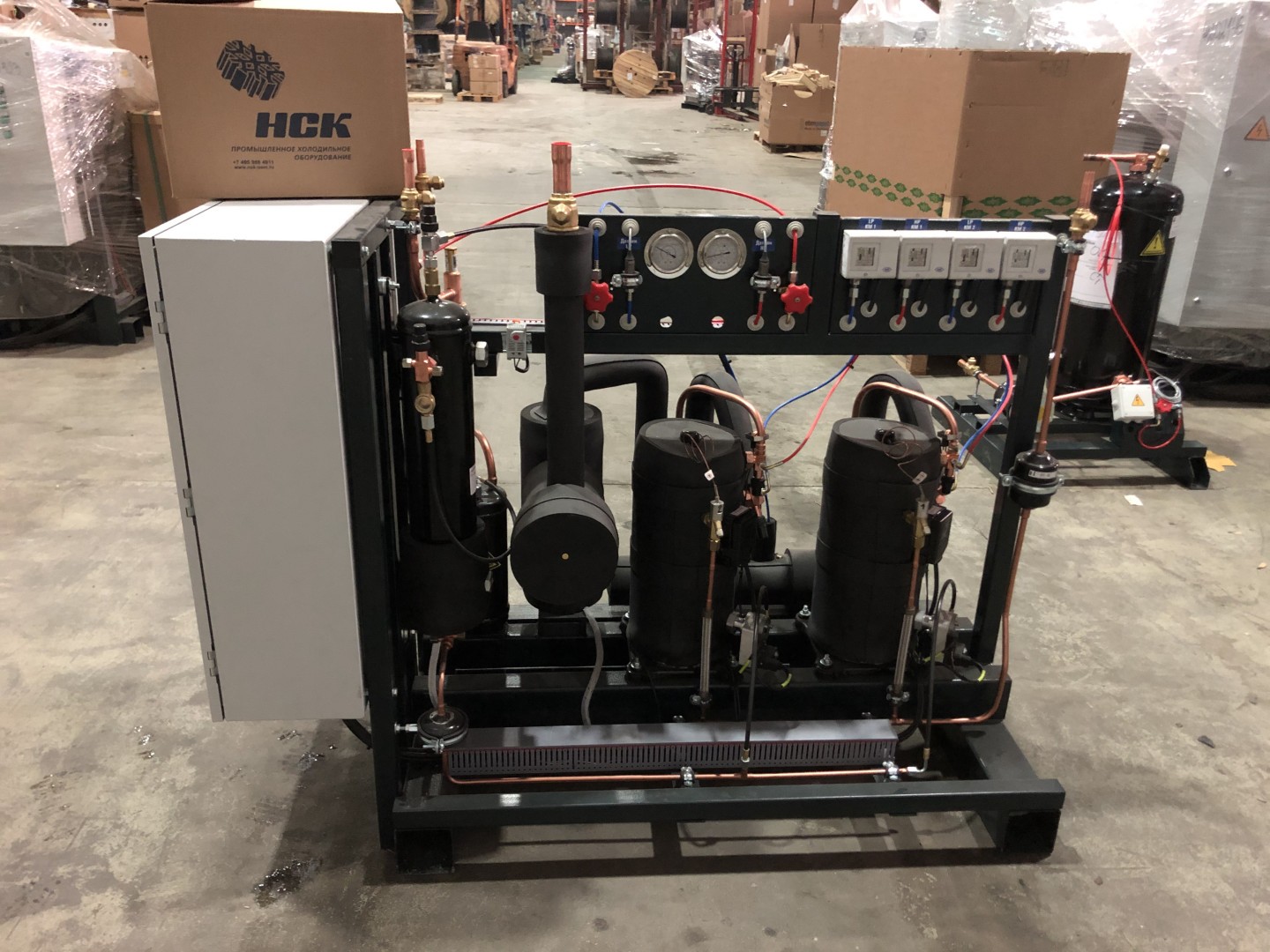 - Холодильная машина (агрегат) + управление и автоматика для стабильной работы системы.