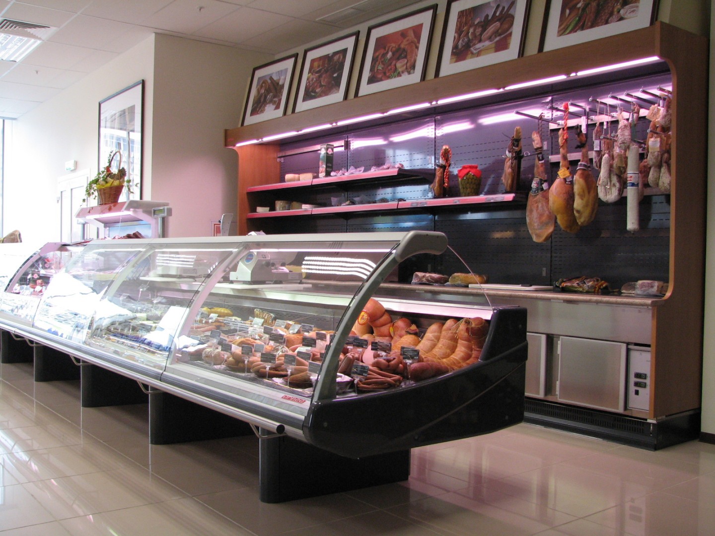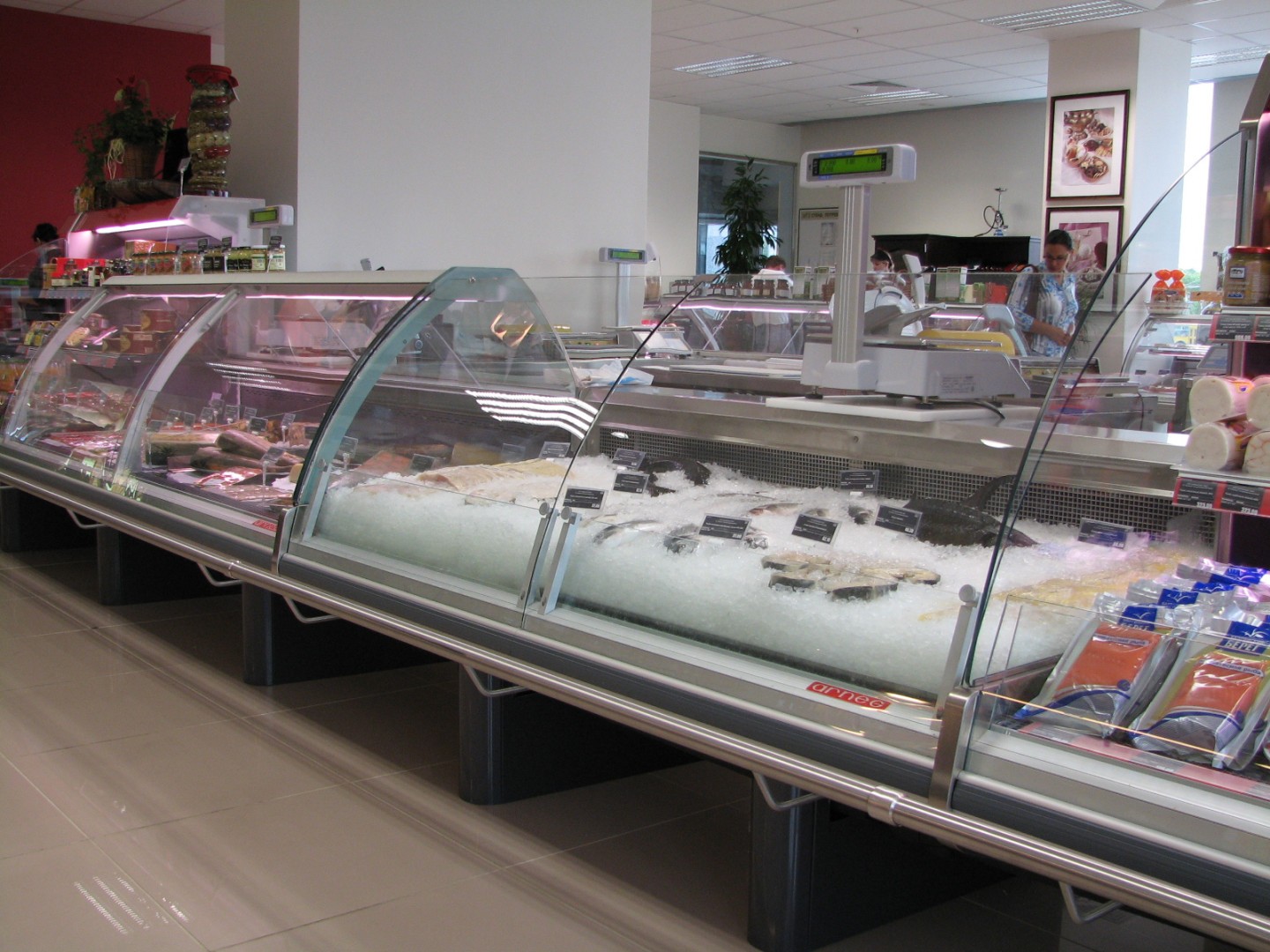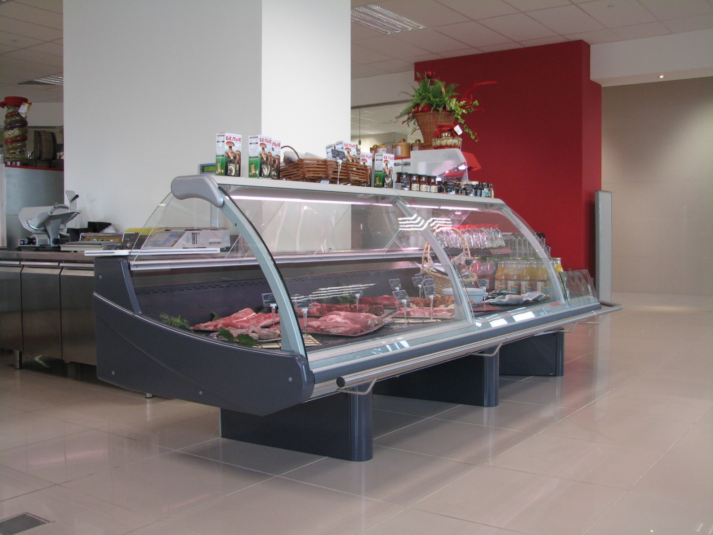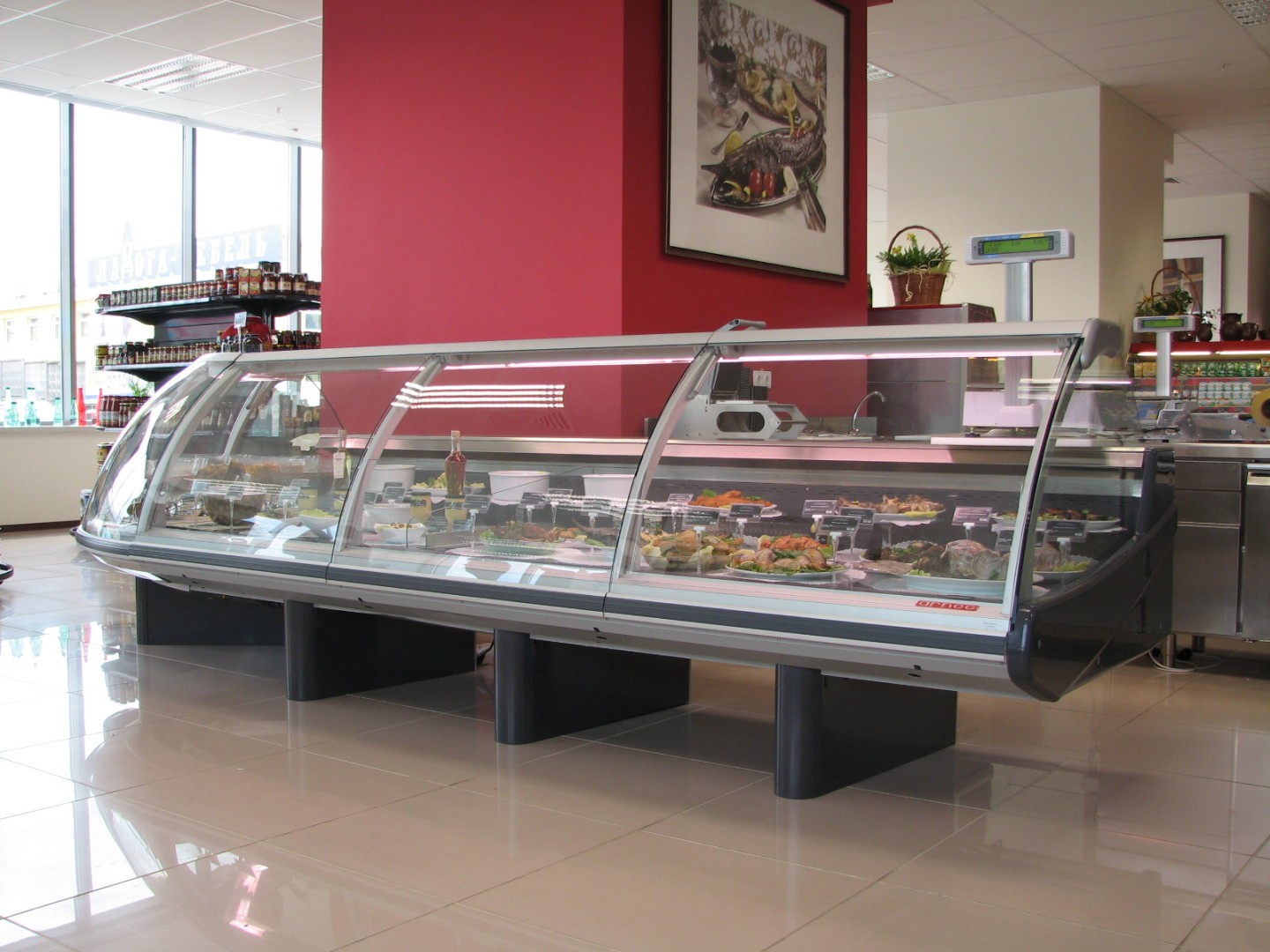 - протяжённые линии холодильных прилавков-витрин для работы через продавца (мясо/рыба/деликатесы/кулинария);