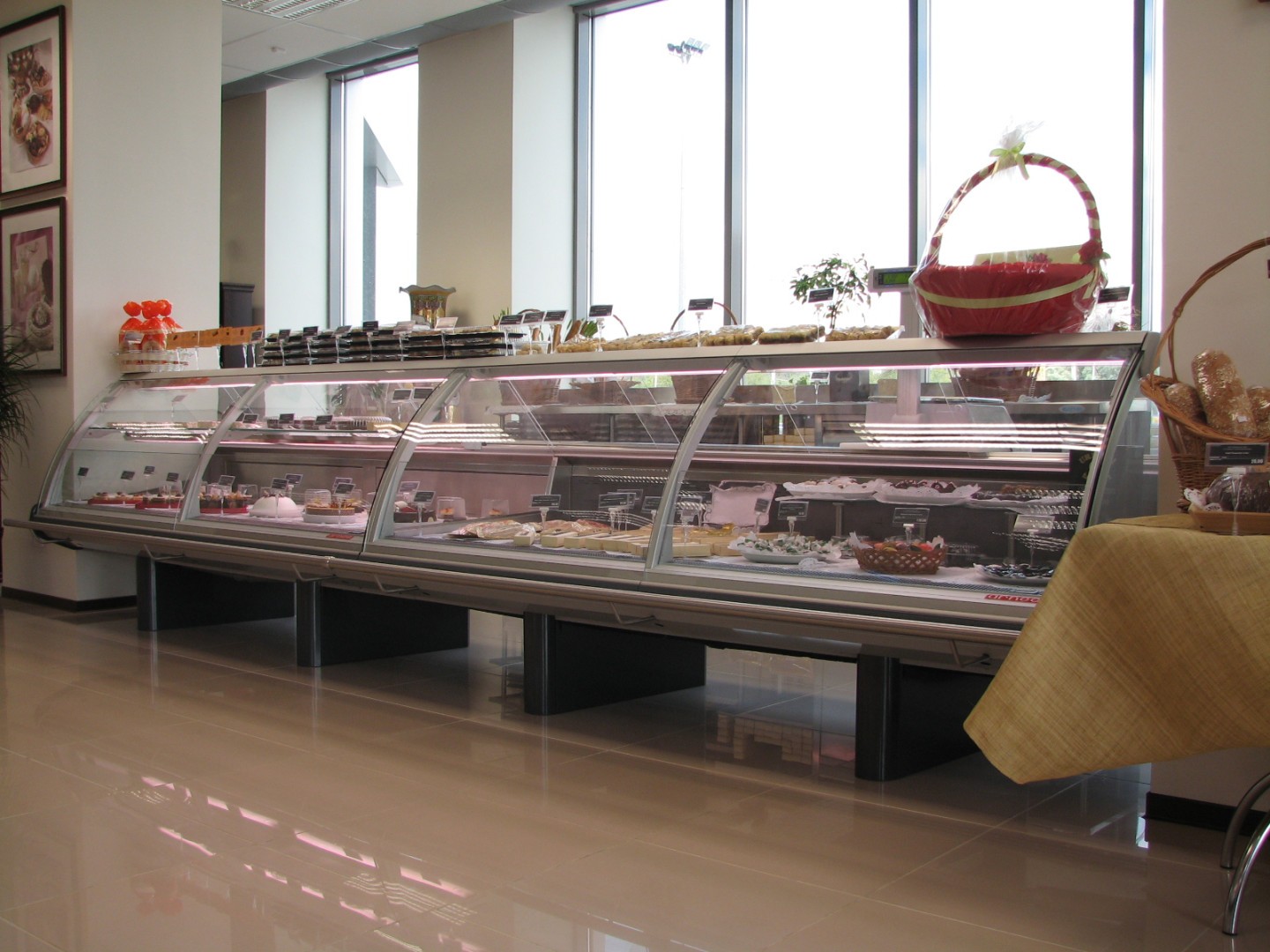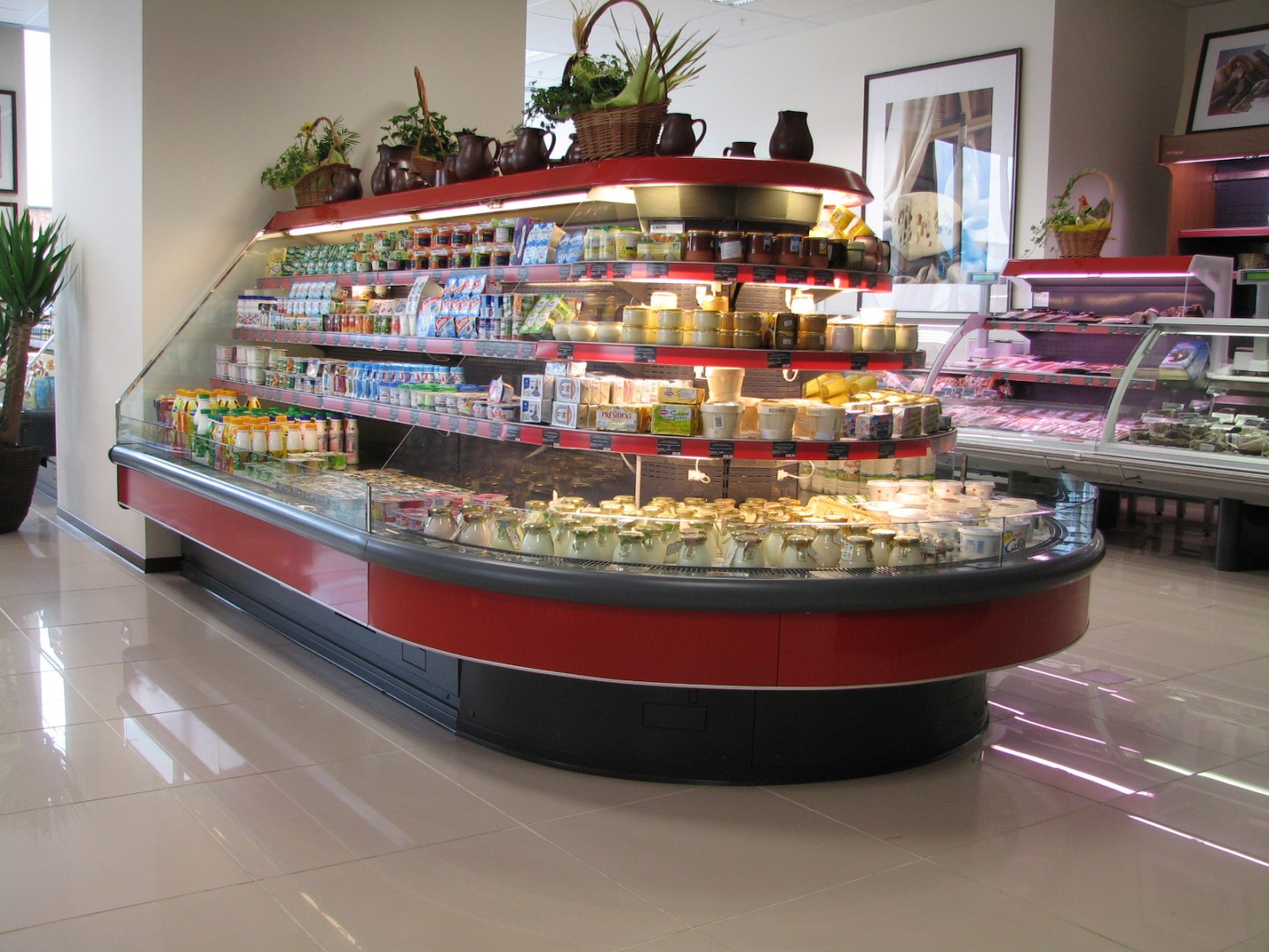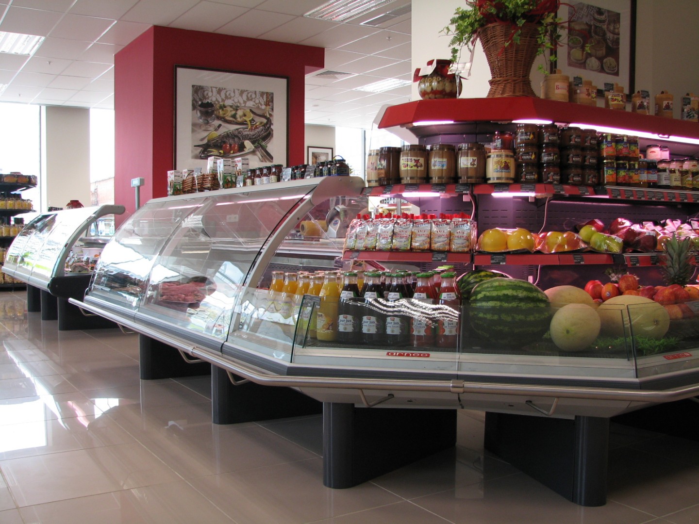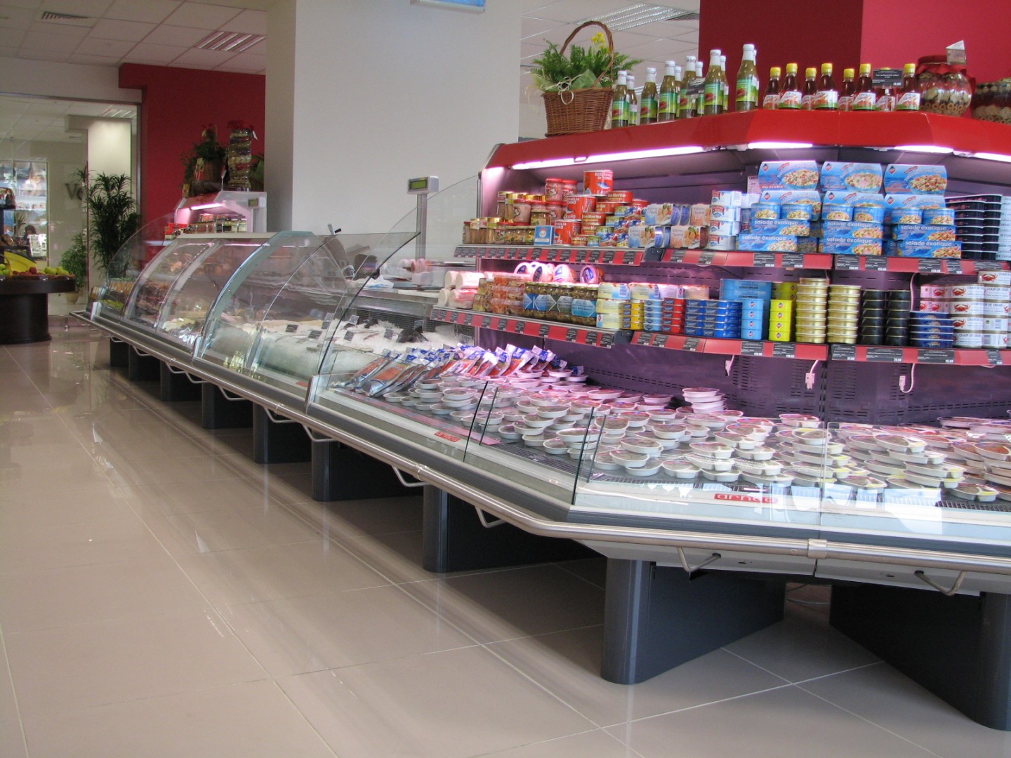- протяжённые линии холодильных прилавков-витрин для работы через продавца (мясо/рыба/деликатесы/кулинария);