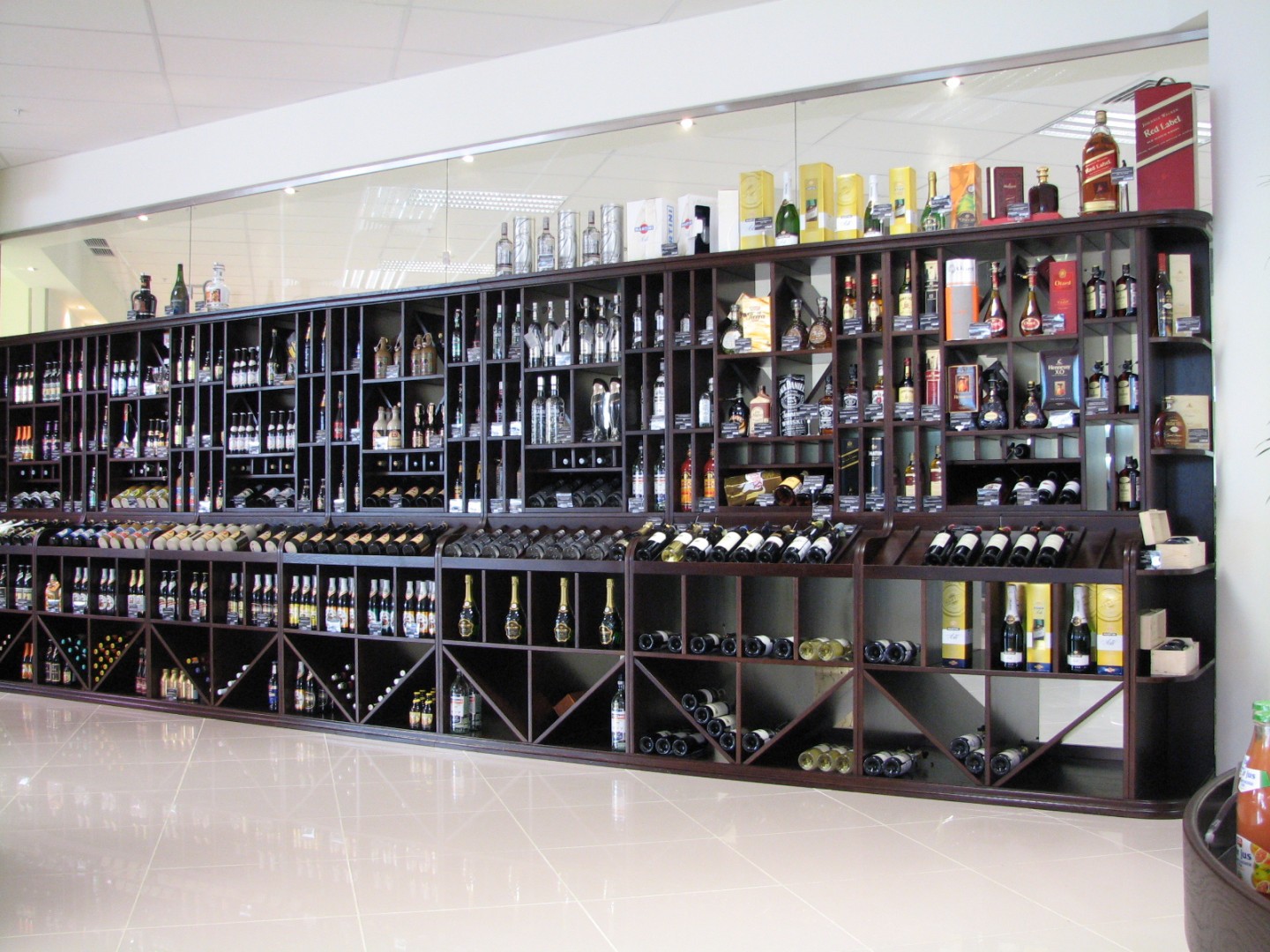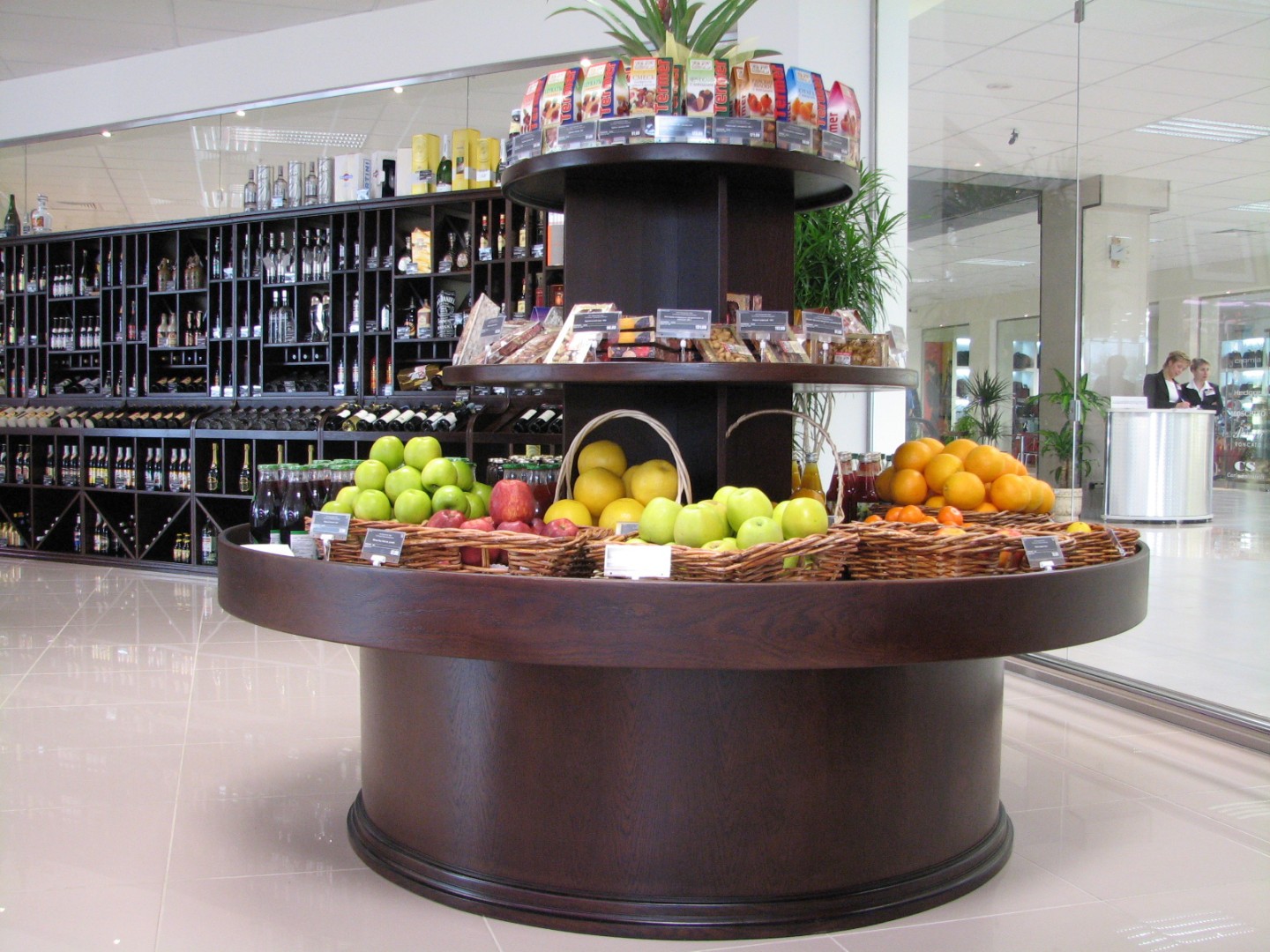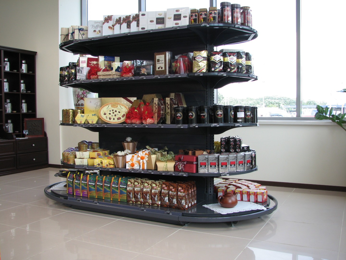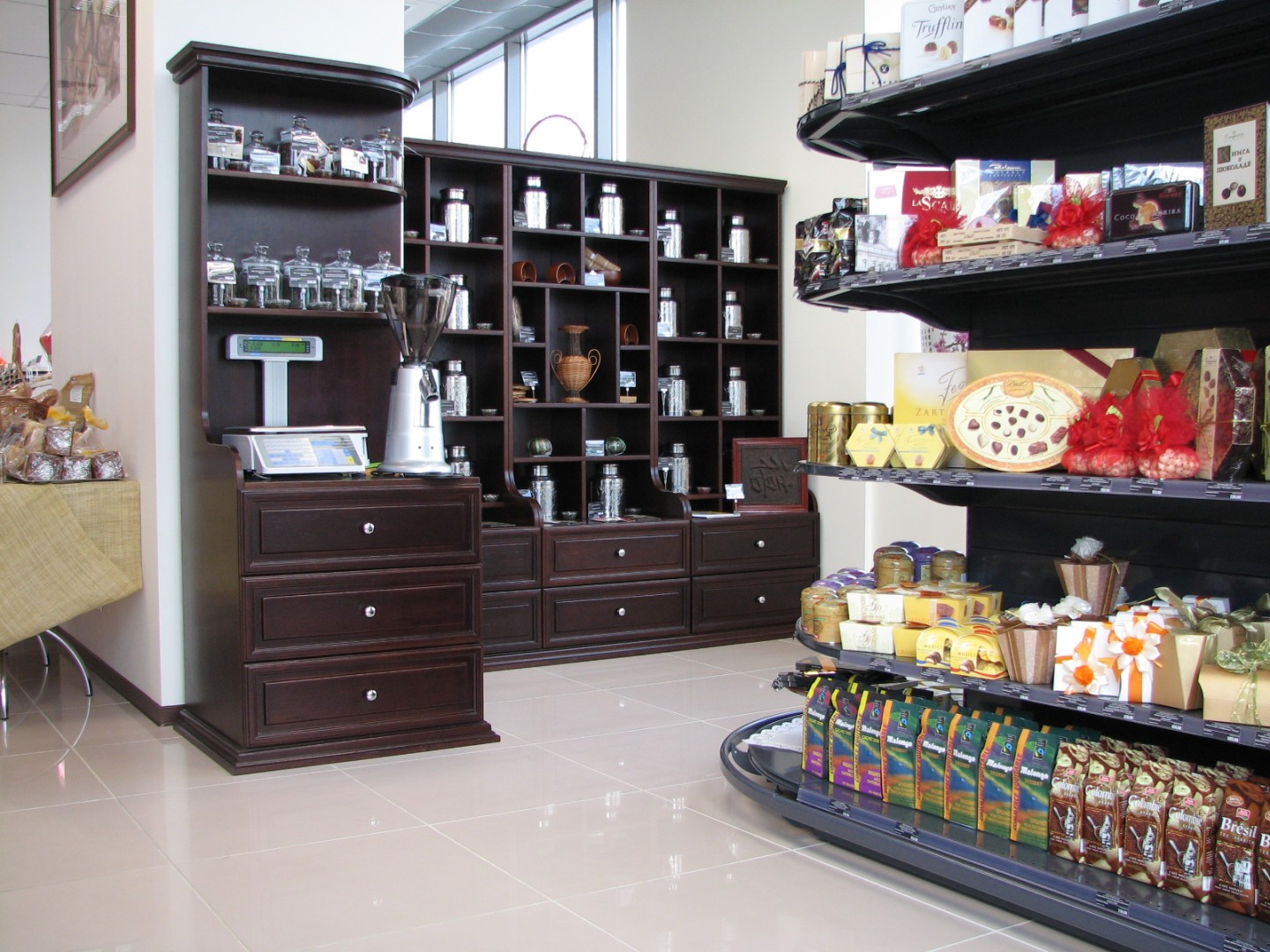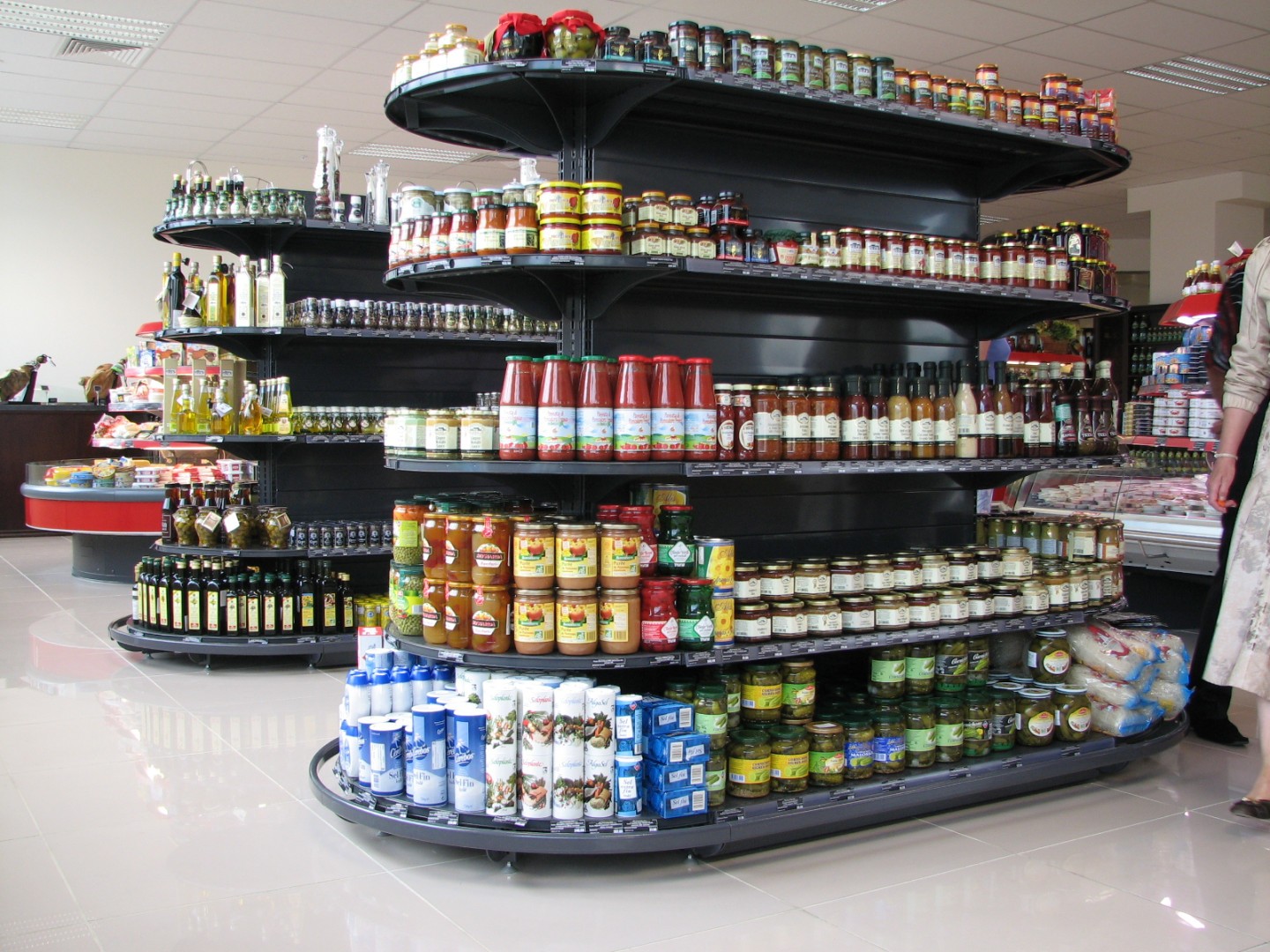 - нейтральное торговое оборудование: пристенные стеллажи и островные гондолы под бакалею/соусы/подарочные наборы и сопутствующие товары;