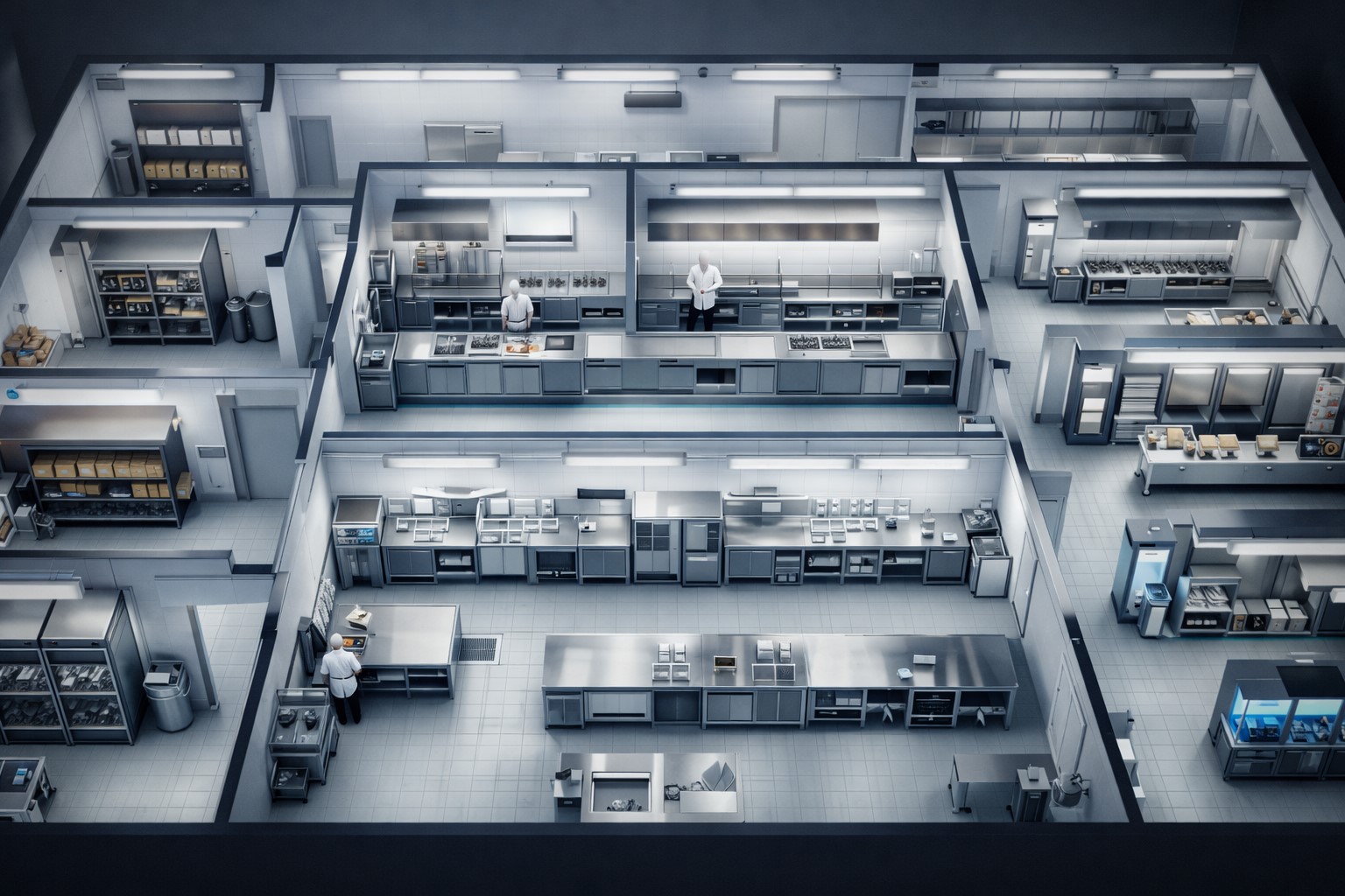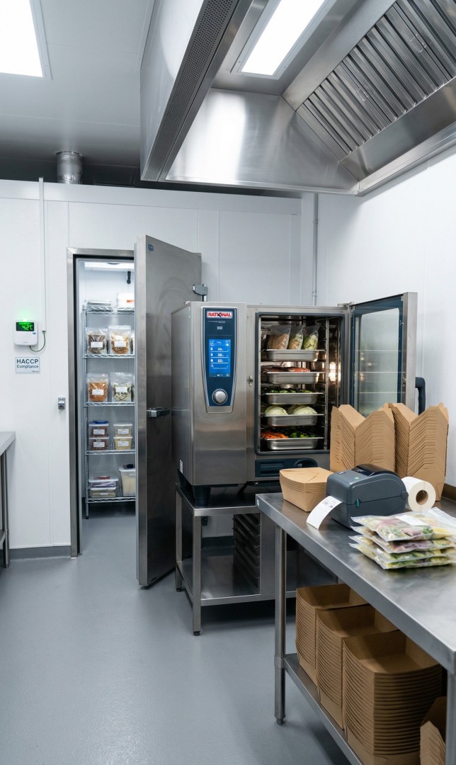 Dark kitchen: компактная, скорость 15 мин/заказ, зона комплектации, стеллаж курьеров. Фабрика: промышленная, 1000+ порций, cook&chill, вакуум, камеры. Не продаём «одно и то же» — подбираем точно под формат.
