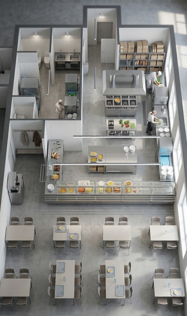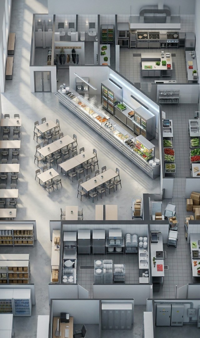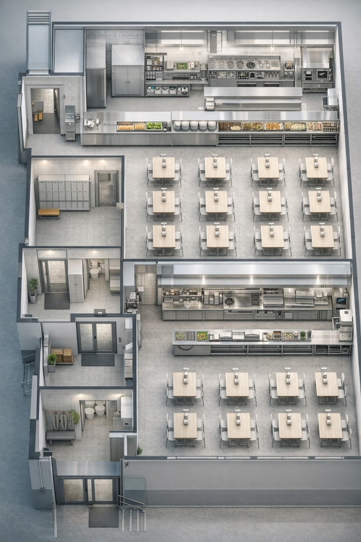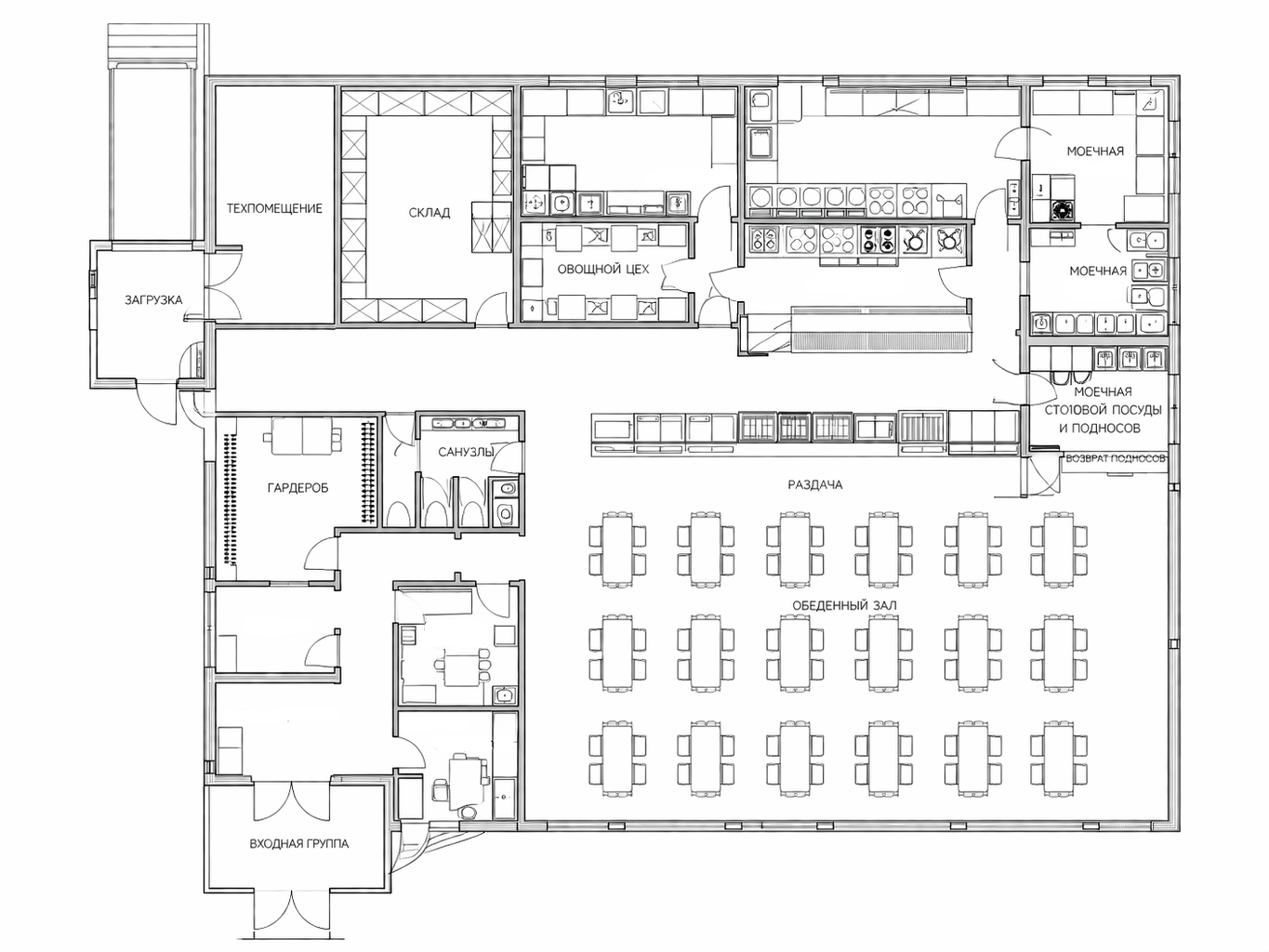 - Пароконвектомат, грили, фритюрницы, холодильные столы-саладетты, камера, упаковочная зона. Без зала — только кухня