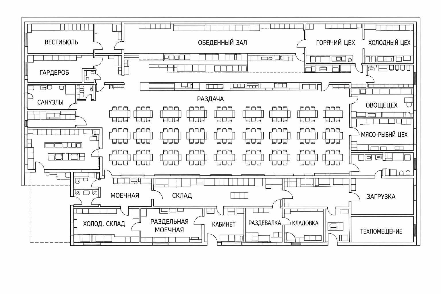 - Линия раздачи (основной элемент!), пароконвектомат, котёл, камера, посудомоечная.