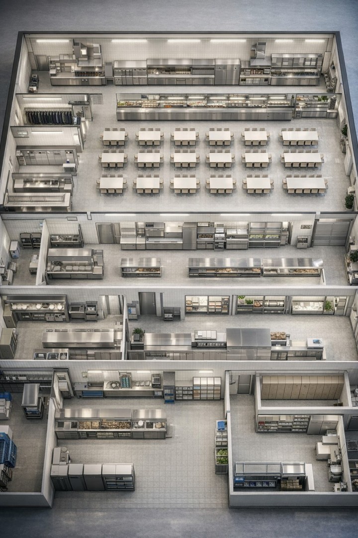- 2–4 пароконвектомата, котлы 250 л, камера шоковой заморозки, линия упаковки, транспортная тара, камеры хранения 50+ м³