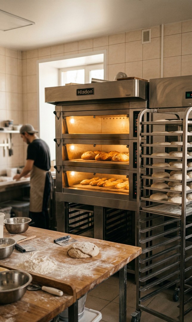 Конвекционная: булочки, пироги, слоёное — равномерный обдув, от 85 000 ₽. Подовая: хлеб на закваске, багеты — хрустящая корка от пода, от 350 000 ₽. Ротационная: 500+ изд/день — загрузка шпилькой, от 800 000 ₽. Неправильный тип печи = неправильный хлеб. Хлеб на закваске в конвекционной = плоская корка без «уха». Круассаны в подовой = не поднимутся.
