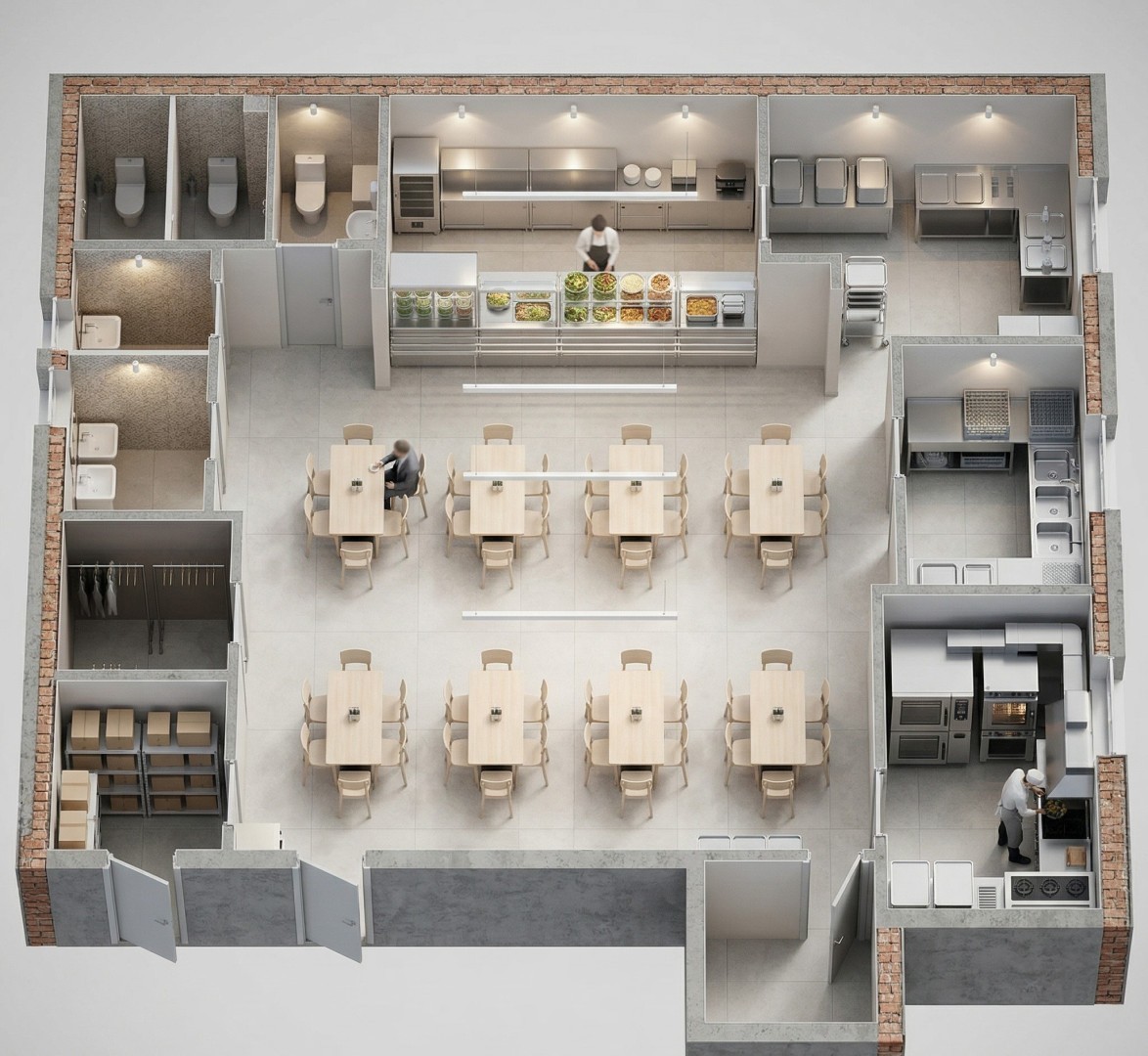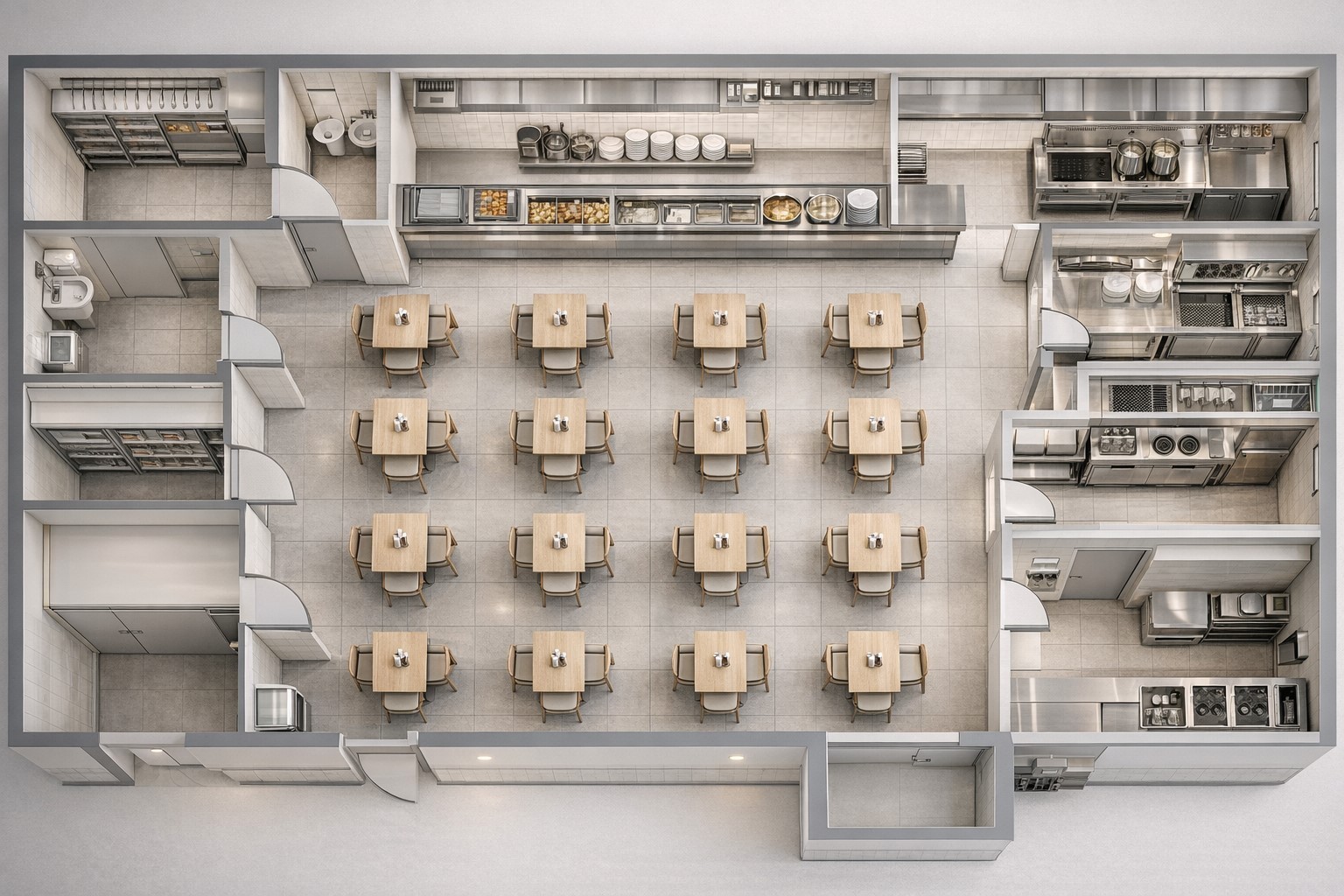 - Линия раздачи 4–6 м: мармит первых блюд + мармит вторых + холодильный прилавок (салаты, молочка) + кассовый узел.