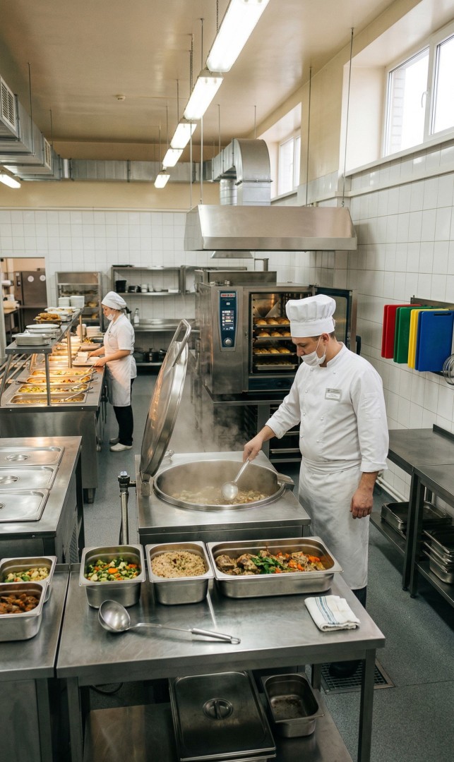 Школьная столовая: СанПиН 2.3/2.4.3590-20 — температура блюд при раздаче ≥65°С (мармиты с подогревом обязательны). Больничный пищеблок: 15 диетических столов по Певзнеру — протирочная машина для пюре/каш. Детский сад: раздельная обработка яиц (отдельная мойка), калорийность по возрастным группам.