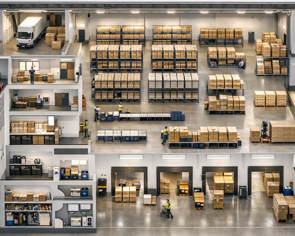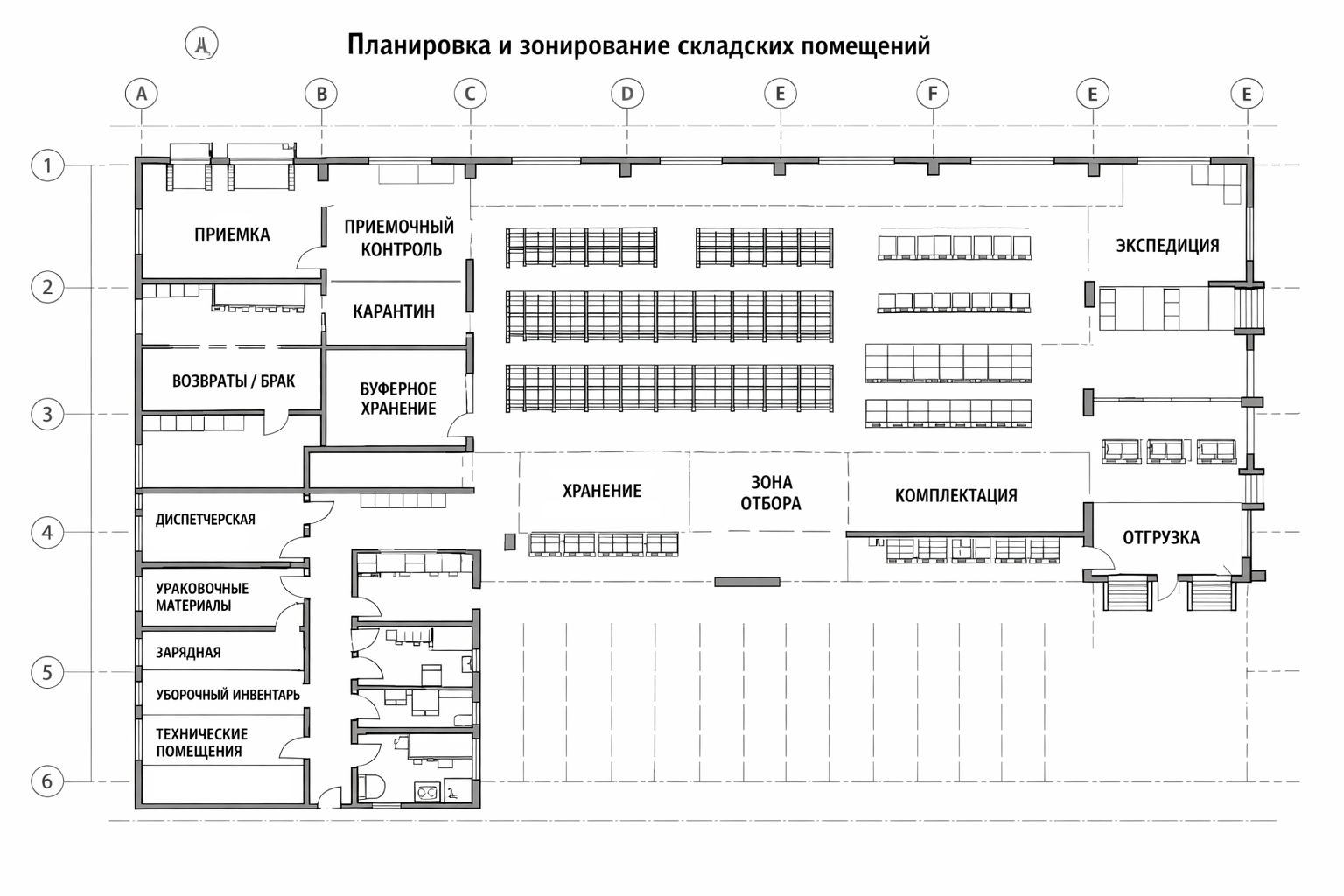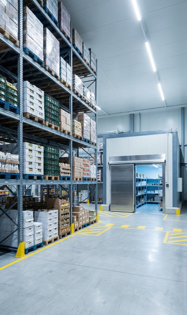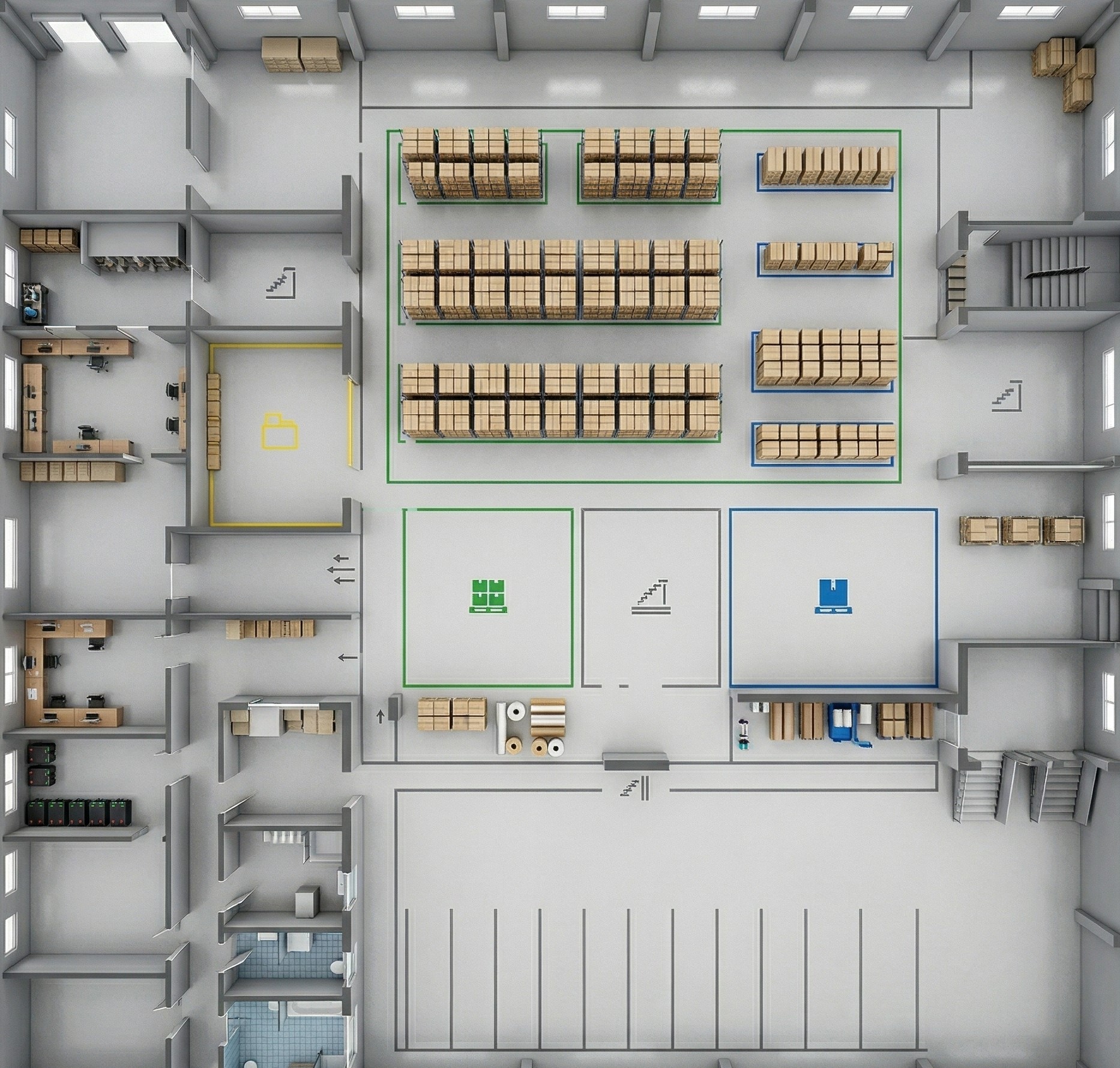 - Большие объёмы: рампы, зоны кросс-докинга, многоярусные паллетные стеллажи, мультитемпературные камеры